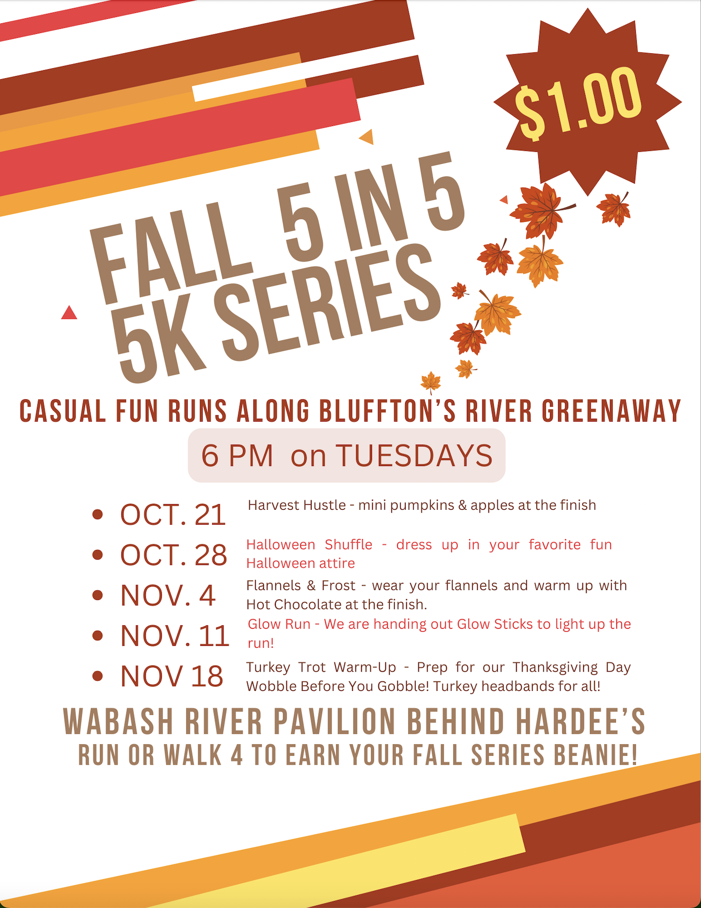 - 18 : 5 in 5 Fall 5K Series (#5) - 6pm, Wabash River Pavilion (behind Hardee's) $1.00